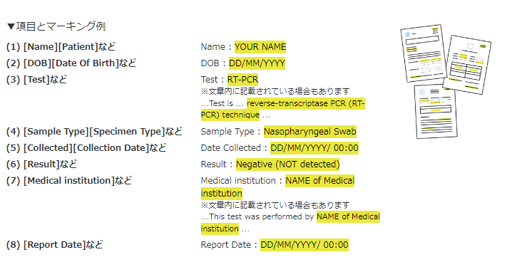 另外,在收到检测证明时,请务必自行确认记载内容中是否有漏记或错字等不完备之处。(※:这家医疗机构不使用日本政府指定的格式。出示检测证明外请自行填写“检查申报书”。)