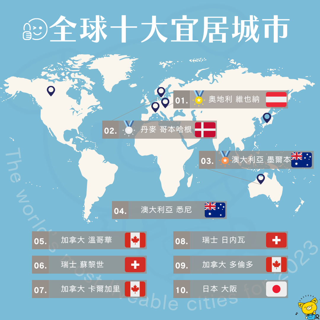 維也納位居榜首,得益於其可靠的基礎設施、卓越的文化與娛樂活動以及無可挑剔的教育和醫療設施。丹麥首都哥本哈根以微弱差距位列第二。澳大利亞的墨爾本和悉尼分別排名第三和第四。加拿大有三個城市進入前十,分別是溫哥華(第五位)、卡爾加里(第七位)和多倫多(第九位)。瑞士的蘇黎世排名第六,日內瓦和卡爾加里並列第七位。而大阪則位列第十。