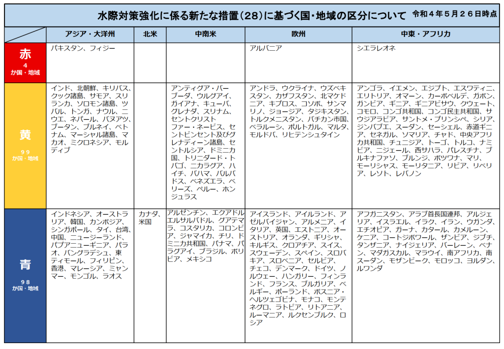 其中,包括韓國和美國在內的98個國家和地區的參賽者被認定為感染風險最低(藍色區域)。